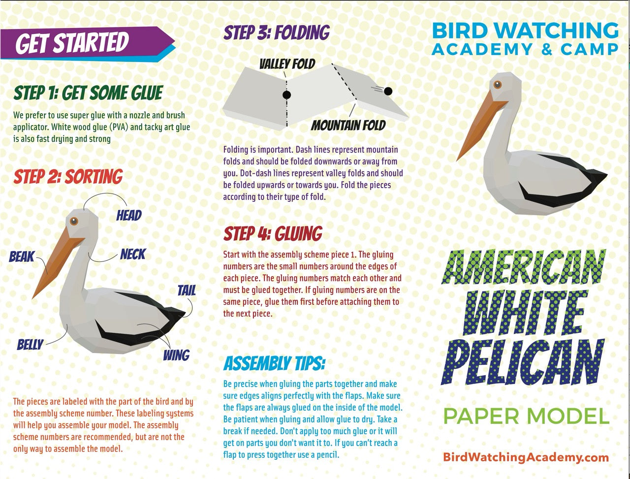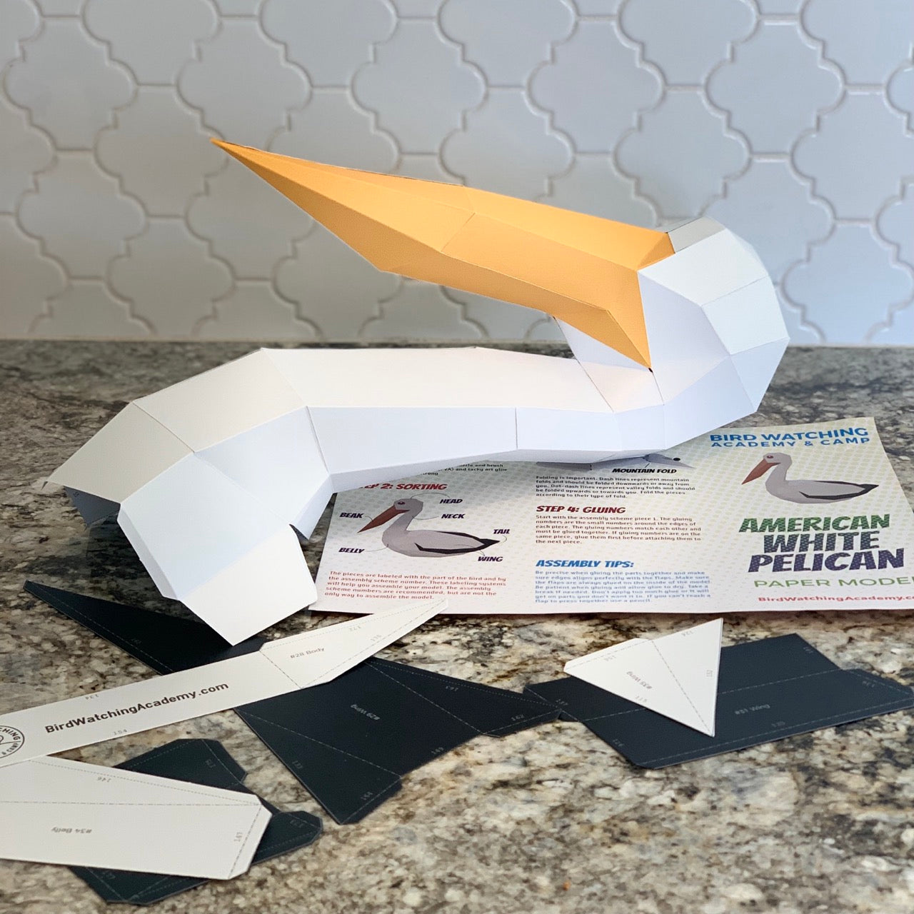 This American White Pelican 3D paper craft model is a great way to learn about birds and have fun doing it. This model is like a puzzle where you have to connect the pieces together. It is designed for adults or skilled crafty teens. The difficulty level is medium to hard but is fun.